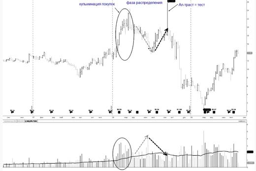 Далее происходит окончание тренда в виде фазы распределения.