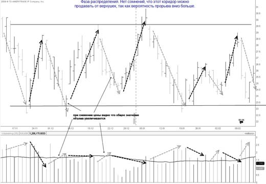 Но если в частности представить идеализированную ситуацию, то каждый бар отката вниз будет на постепенно снижающемся объеме, а каждый бар повышения (после отката) на повышающимся объеме. Помните, что идеальные ситуации встречаются крайне редко.