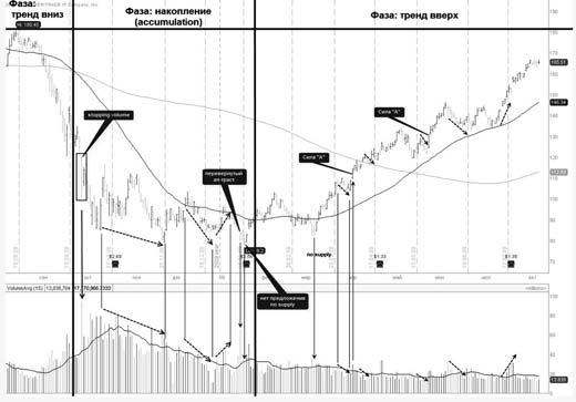 Начинается эта фаза, как правило, с останавливающего объема (stopping volume) на даун-баре (первый признак силы). Но при этом обычно движение имеет свойство продолжаться, но не значительно. Далее, очень часто, появляется так называемый паттерн "кульминация продаж" (selling climax), при этом кульминация продаж не обязательный критерий для окончания тренда вниз, и является часто лишь началом фазы накопления, однако вполне возможен разворот после stopping volume (обычно, чем больше таймфрейм и уровень тренда, тем чаще фаза накопления будет проявляться в виде selling climax.