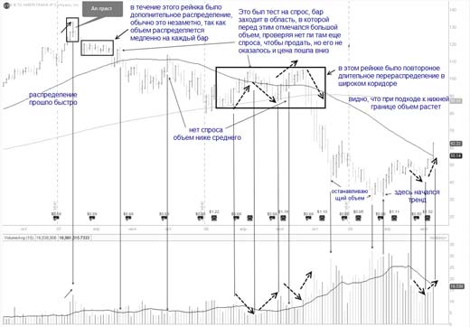 1 Цена начинает двигаться вниз очень медленно барами с узкими спредами вниз и на понижающимся объеме, вплоть до того, пока не возникнет либо ап-траст, либо "отсутвие предложение"( no supply), либо "слабость В".