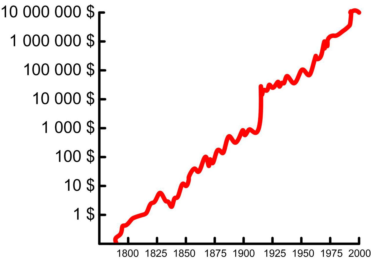 Инвестиции в акции на длительных промежутках времени с большой вероятностью дадут прибыль, нежели убыток. Чтобы подтвердить этот тезис, взгляните на график ниже: там показано, что стало бы со всего лишь одним долларом, вложенным в фондовый рынок США. Через 200 (!) лет $1 превратился бы $10 000 000. Есть над чем задуматься: