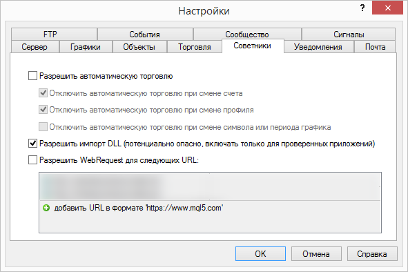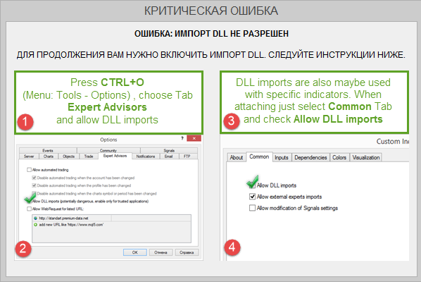 Разрешить импорт DLL можно при добавлении индикатора, но в постоянной работе это очень отвлекает. Если у Вас эта опция будет не включена, индикатор выведет на экран графика сообщение об ошибке и напомнит о методах ее устранения: