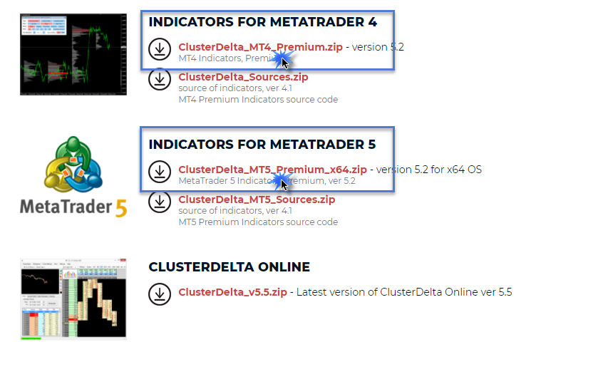 Перед установкой индикаторов в своей терминал Вам нужно скачать их со страницы Скачать индикаторы для MetaTrader. Выберите набор индикаторов исходя из своей версии терминала.