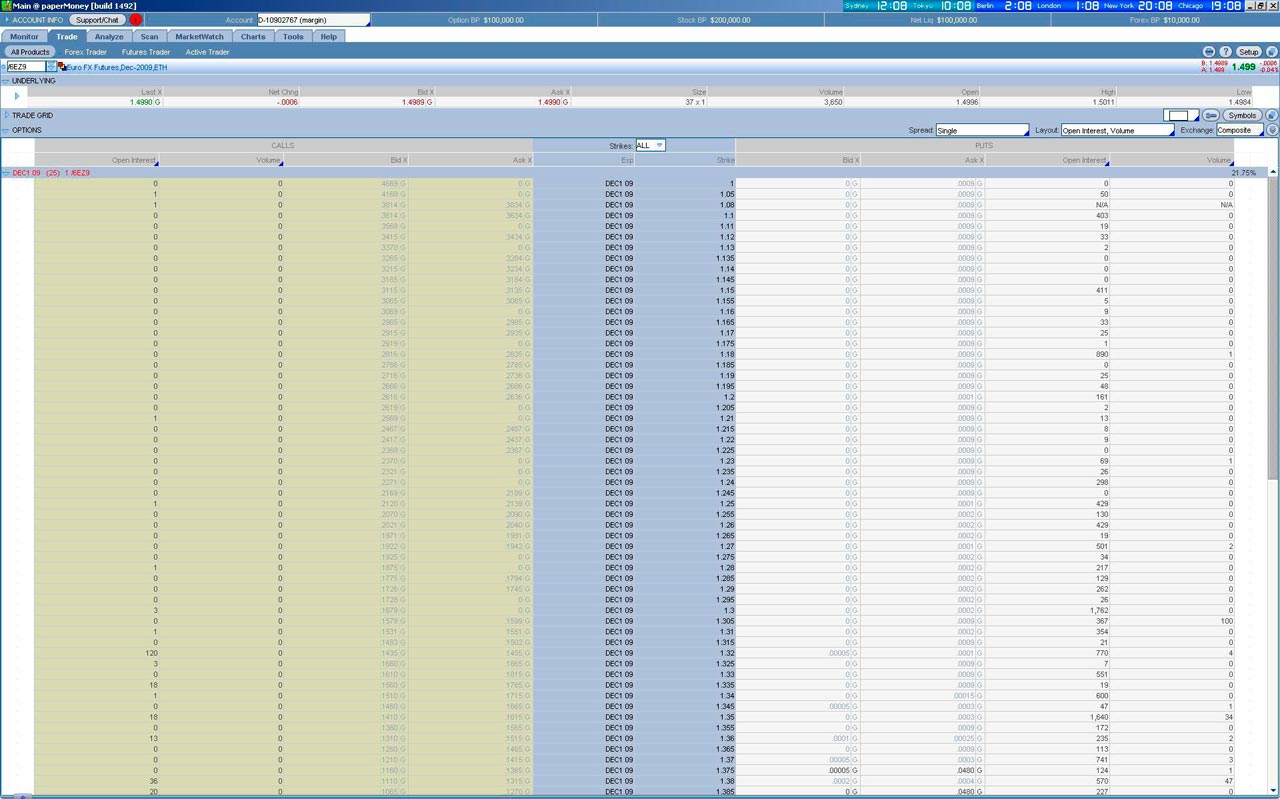 На рисунке ниже вы можете видеть опционный деск. На нем представлены страйки опционов на евро с шагом в 50 пунктов, цены спроса и предложения, объем и открытый интерес.