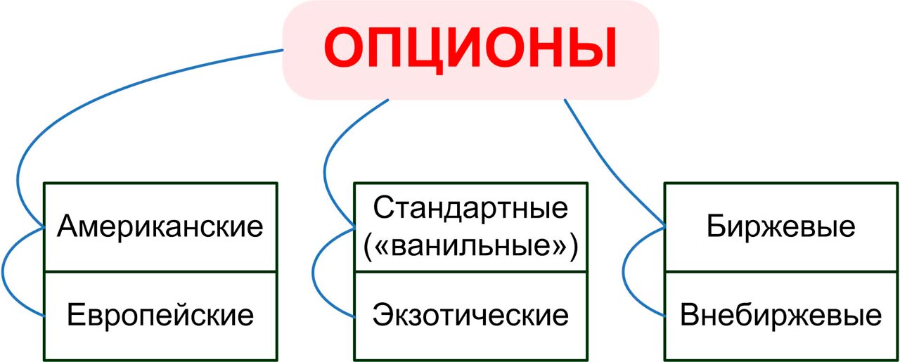 Существует много типов опционов, но основная классификация представлена на рисунке. Мы же в основном будем иметь дело с американскими стандартными биржевыми опционами.