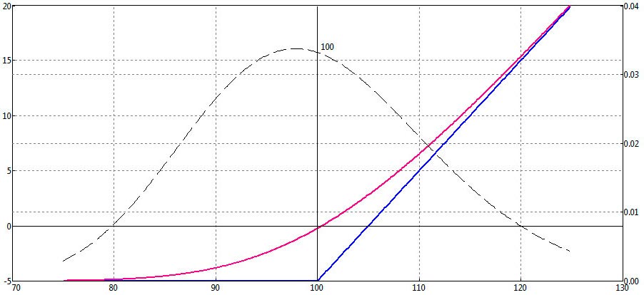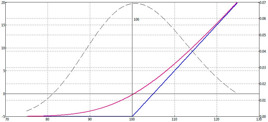 Итак, допустим, мы купили за 50 долларов опцион Call на EURUSD со сроком истечения 1 декабря 2011 года и страйком 1800. Это значит, что мы заплатили премию в 50 долларов за право 1 декабря купить фьючерс на евро по цене 1800. Таким образом, предполагаем рост евро и платим за право купить 1 декабря евро по заявленной цене (страйку). Пусть евро вырос, и 1 декабря евро будет стоить 2200, а мы его купим за 1800. Прибыль составит 400 пунктов. Но мы заплатили за такую возможность 50 пунктов. Тогда чистая прибыль 400-50=350 пунктов.
