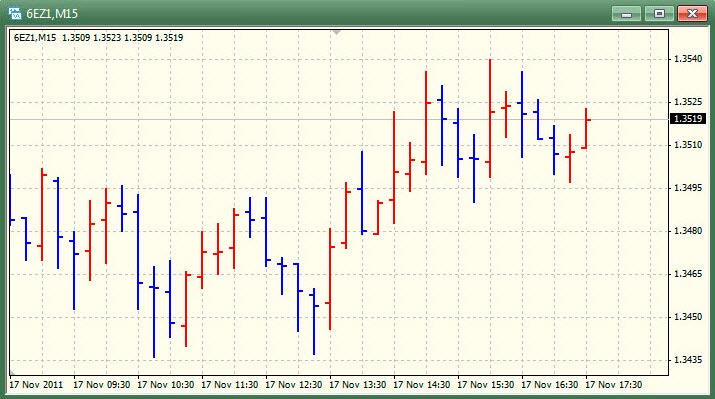 3. График отрезков (бары) - на баровом графике изображают максимальную цену (верхняя точка столбика), минимальную цену (нижняя точка столбика), цену открытия (черточка слева от вертикального столбика) и цену закрытия (черточка справа от вертикального столбика).