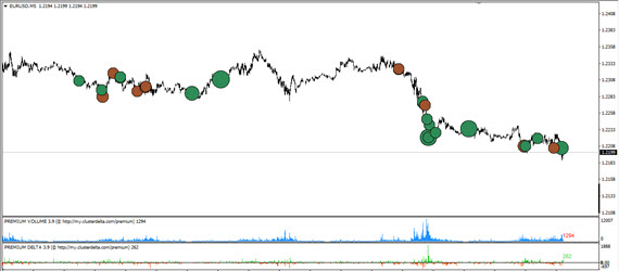 The Splash indicator is the first indicator in the ClusterDelta series that deeply analyzes tick history. This indicator is designed to search for large spikes in volume, when a large amount of the volume has passed in a short period of time.