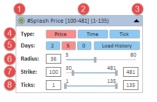 7 (Strike) - the range of volume values that is used to plot on the chart. The minimum value is defined by the The Lowest Strike Value parameter; to optimize the load, the minimum accumulation value is set at 20 lots. The maximum is defined on the actual data. In the graphical panel, the current values can be changed with the slider or by editing the value in the text fields.