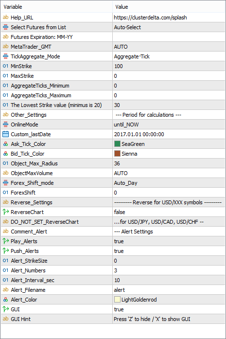 - Alert_StrikeSize - the size of the value after that the alert event will be triggered. If the value is "0", it determines automatically based on the current parameters.