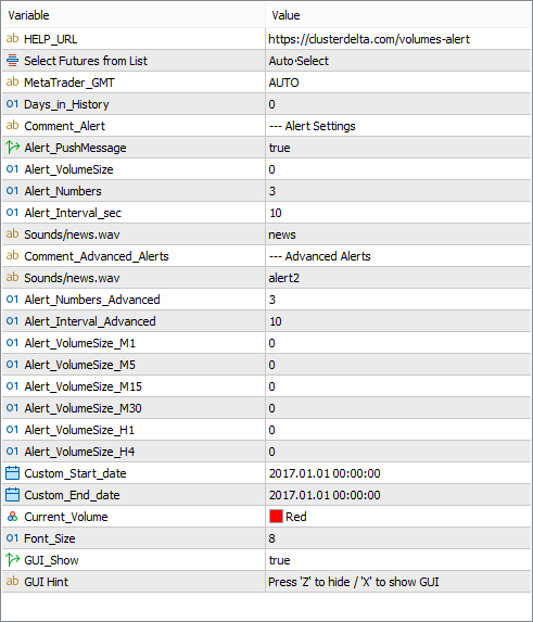 • Alert_Filename - the file that will be used to play alert triggered by Alert_VolumeSize (there are some .wav files in the folder МТ5\Sounds (MT4\Sounds), use only the file name without extension)